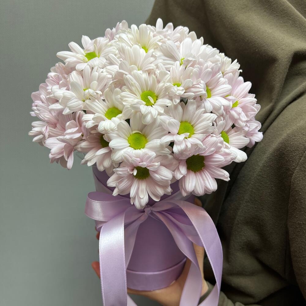 Шляпная коробка с цветами «Нежная белая хризантема в коробке»