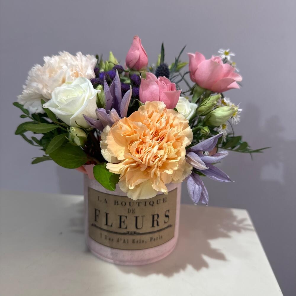 Коробка с цветами «Нежная композиция» из роз и эустом