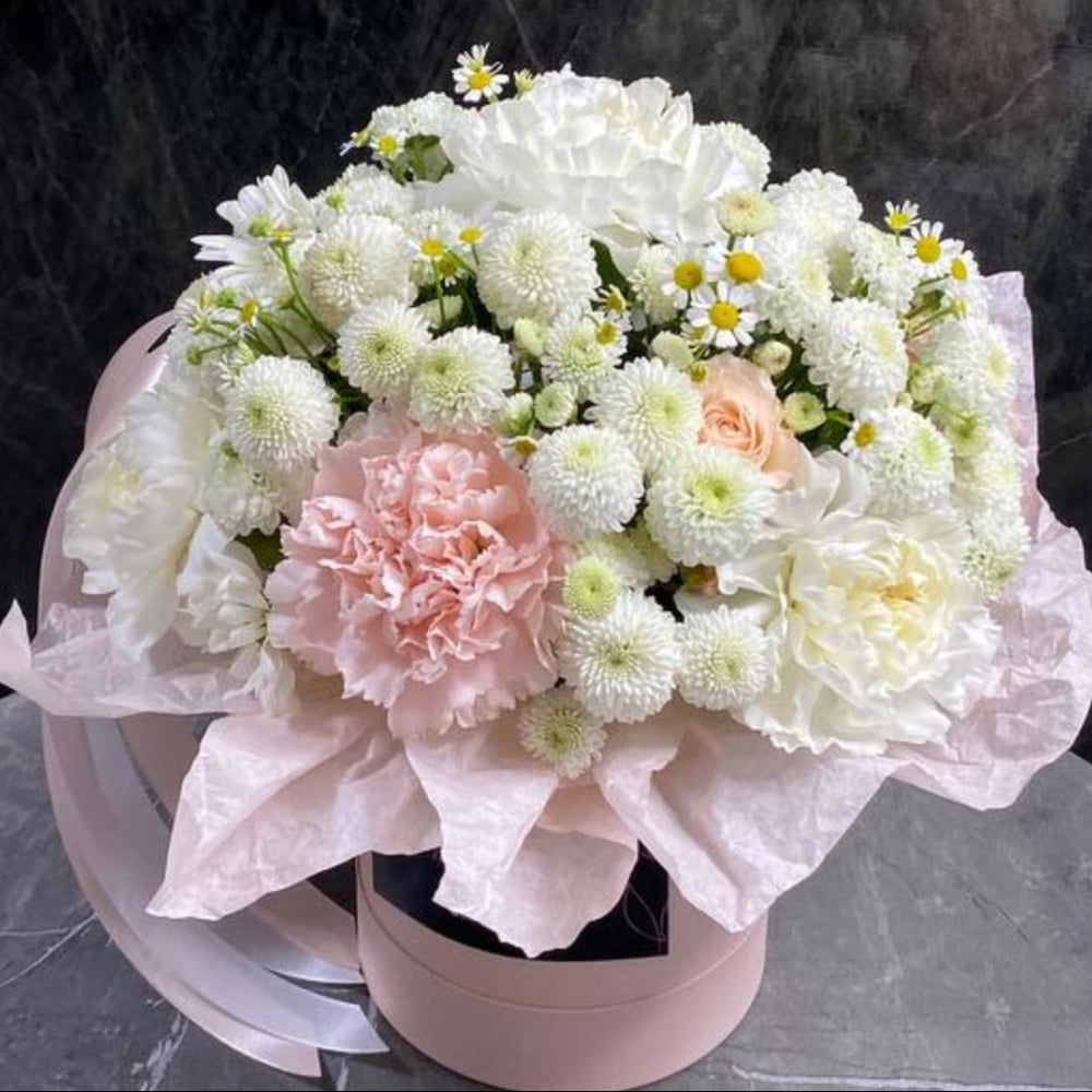 Нежная композиция из диантусов, хризантем и ромашек в шляпной коробке🌸 На день рождения, Новый год, свидание, любое другое мероприятие или просто для хорошего настроения🌸маме, жене, сестре, девушке, дочери, коллеге, подруге или любой другой получательнице☺️ В профиле Вы можете добавить игрушку или украшение к букету🎁