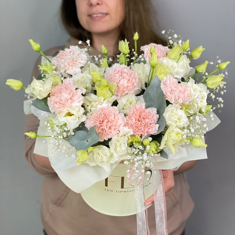 Шляпная коробка с цветами «Нежная композиция с лизиантусом (303)» из гвоздик и эустом