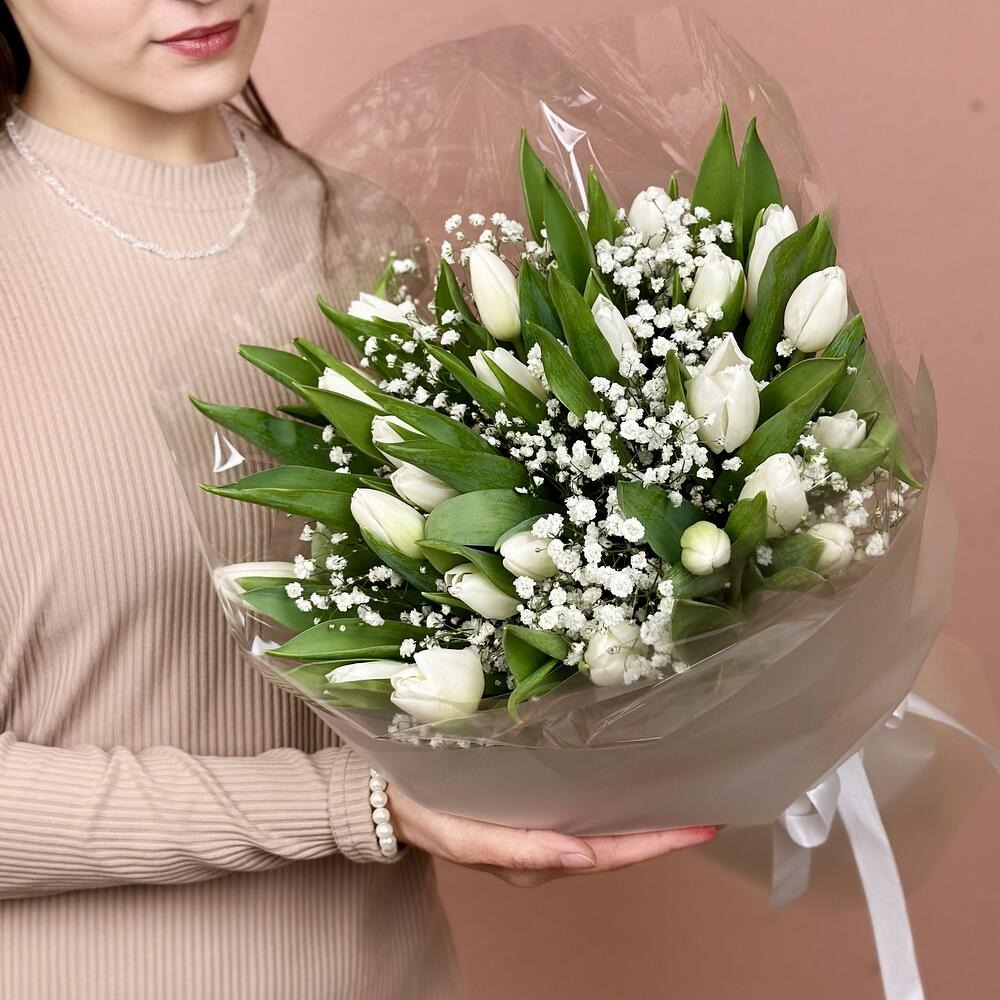 Букет «Нежная симфония» от Mr. Пион 25 белых тюльпанов в обрамлении воздушной гипсофилы — это воплощение изысканной простоты и безупречного вкуса. Лёгкая, воздушная композиция смотрится трогательн...