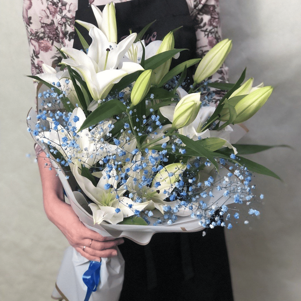 Букет из лилии и гипсофилы подарит хорошее настроение и вызовет получателя!