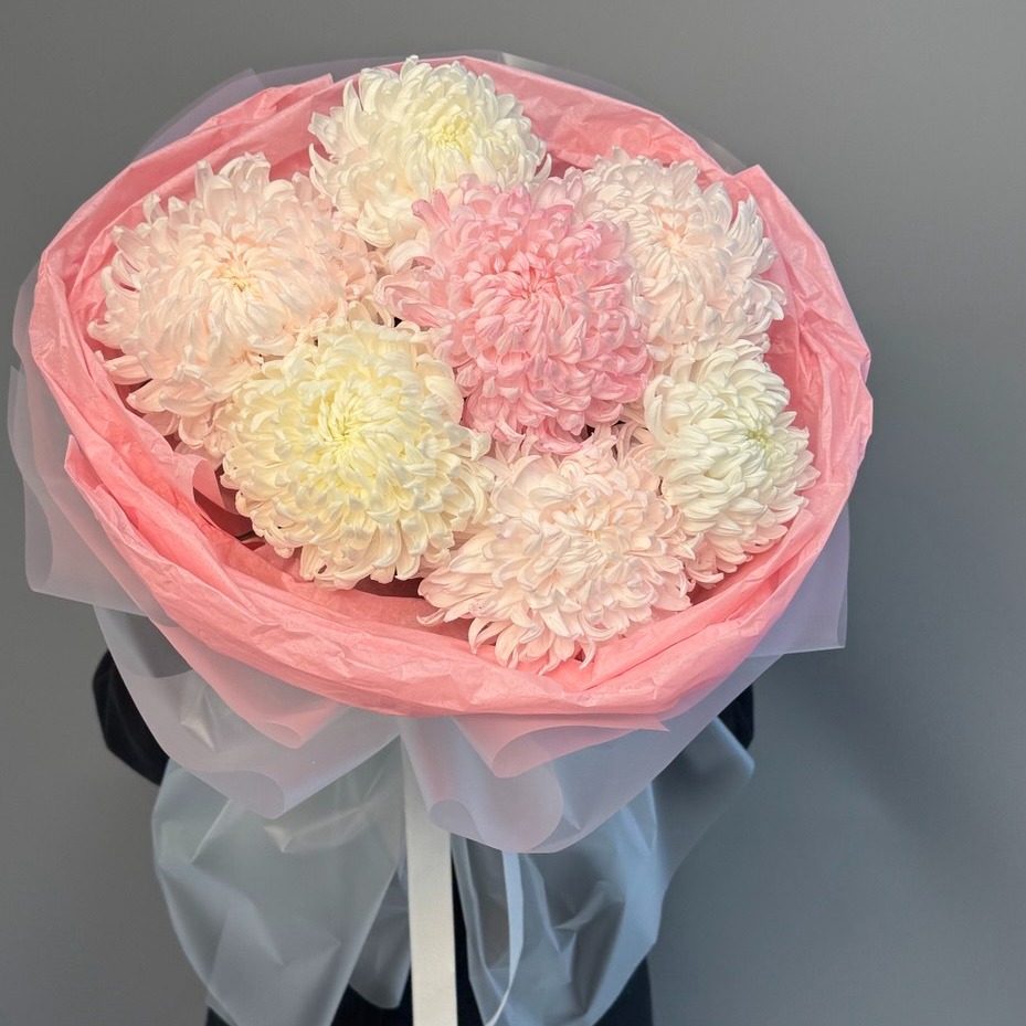 Представляем вашему вниманию великолепный, Нежнейший букет из роскошных хризантем сорта «Бигуди» — воплощение элегантности и природной грации. Каждый цветок словно создан искусным мастером, чьи руки закрутили нежные лепестки в изысканные завитки.