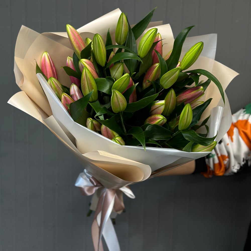 Стойкий букет из лилий Ароматный цветок Лилия розовая 9 штук Дарите эмоции прямо сейчас Индивидуальная упаковка 5 Открытка с вашими пожеланиями 1 Ведь это так просто