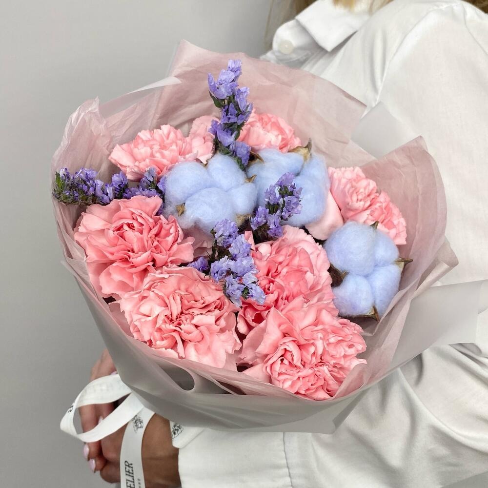 Нежный комплимент с диантусами, статицей и хлопком