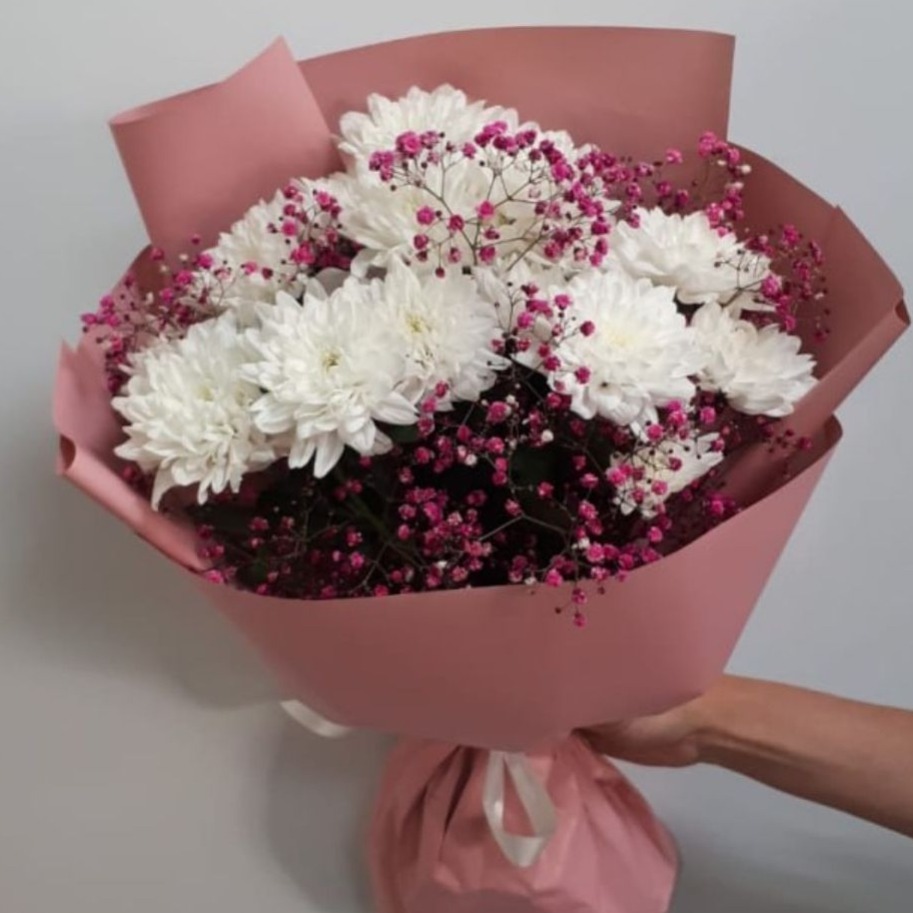 Букет «Нежное Послание» из хризантем и гипсофил