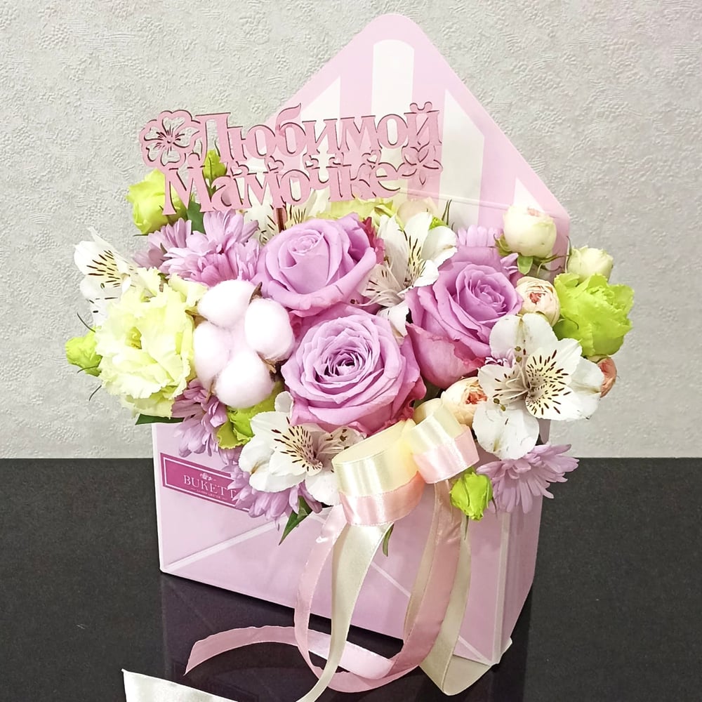 Состав Роза сортовая - 3 шт. Роза пионовидная кустовая - 1 шт. Лизиантус - 2 шт. Альстромерия Микс Европа - 1 шт. Хризантема кустовая - 1 шт. Хлопок - 1 шт. Коробка конверт - 1 шт. Топпер - 1 шт. Лента атласная - 2 шт.