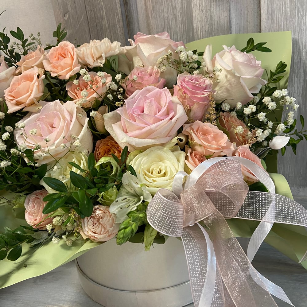 Нежный букет в шляпной коробке для самых счастливых событий!