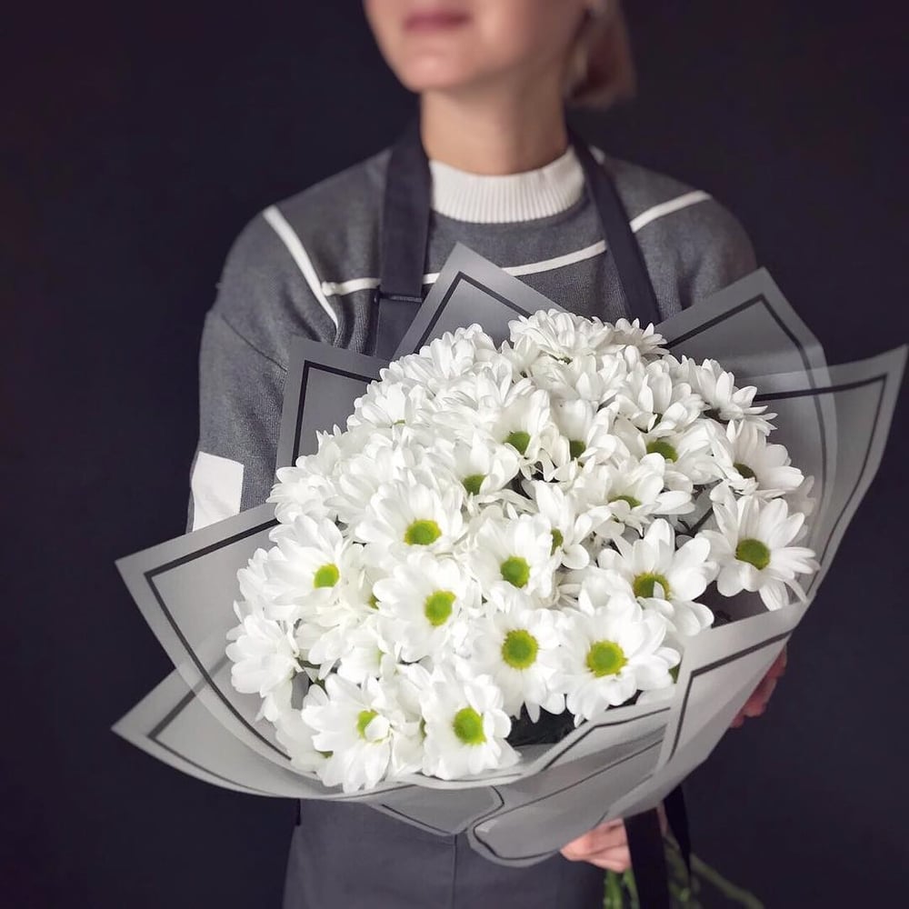 Букет из нежнейшей белой хризантемы, так напоминающей полевую ромашку. Подарит вашей избраннице летнее настроение в любое время года и перенесет ее на летнее поле.отличный подарок по любому поводу д…