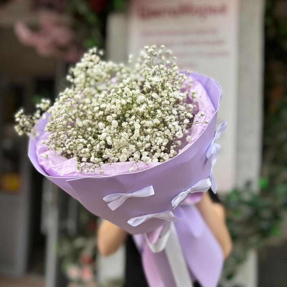 Нежный букет из гипсофил в круглой упаковке с бантиками!