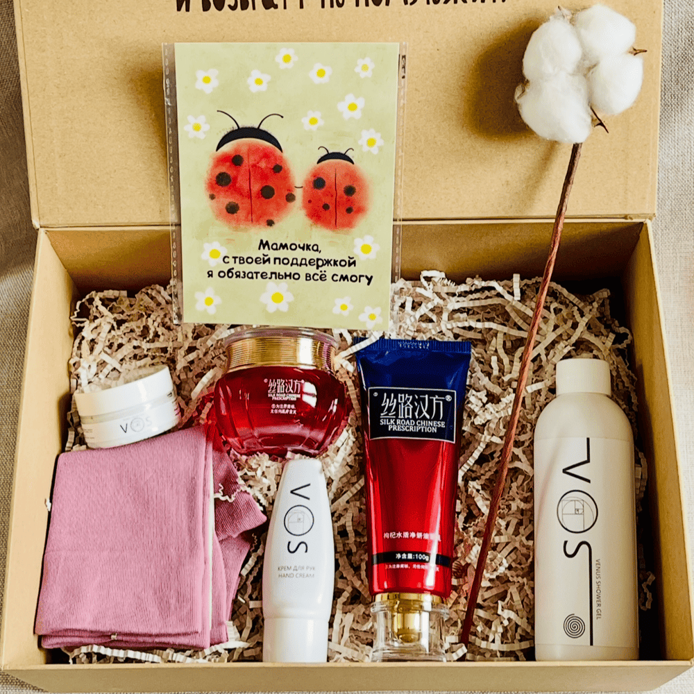 Этот набор — про тепло, которое мама всегда дарит первой. Про заботу без условий, про нежность, которая не требует слов. Крем уменьшает видимость морщин и пор, повышает упругость кожи и обеспечивает длительную антивозрастную защиту. Пенка бережно очищает лицо, придает коже сияние и свежесть. Крем для рук дарит рукам мягкость и комфорт. Маска для лица - как нежные объятия для кожи: она глубоко питает, восстанавливает и возвращает ощущение мягкости и уюта. Мягкий гель для душа окутывает тело легкой воздушной пеной, балует бодрящим ароматом мандарина с древесными нотами и горчинкой бергамота. Розовые носочки и цветок хлопка добавляет набору ощущение уюта и натуральной нежности Состав 1. Роскошный крем для лица восстанавливающий, подходит для всех типов кожи, с экстрактом ягод Годжи (50г). 2. Мягкая пенка для умывания с экстрактом ягод Годжи (100г). 3. Крем для рук от российского органического бренда VOS (30мл). 4. Питательная маска для лица (30 мл) от VOS. 5. Гель для душа Venus от VOS (200мл). 6. Базовые хлопковые носочки от Tenden 7. Цветок хлопка. 8. Дизайнерская открытка для мамочки 9. Крафтовая коробка из плотного картона на магнитном клапане с вдохновляющей надписью.