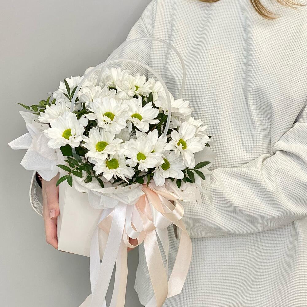 Цвет сумочки может быть другого цвета!!! Классическая композиция из Ромашек Композиция из хризантемы ромашковидной под названием «Нежность» — это милый и трогательный подарок, который передаёт са…