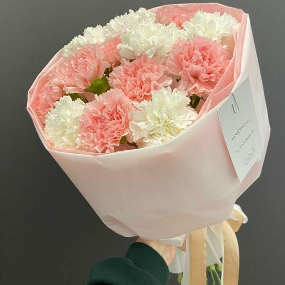Нежный букет из белых и розовых гвоздик, аккуратно упакованный в светло-розовую бумагу. Дополнен элегантной лентой пастельного оттенка. Сочетание мягких тонов создаёт романтичный и утончённый образ —…