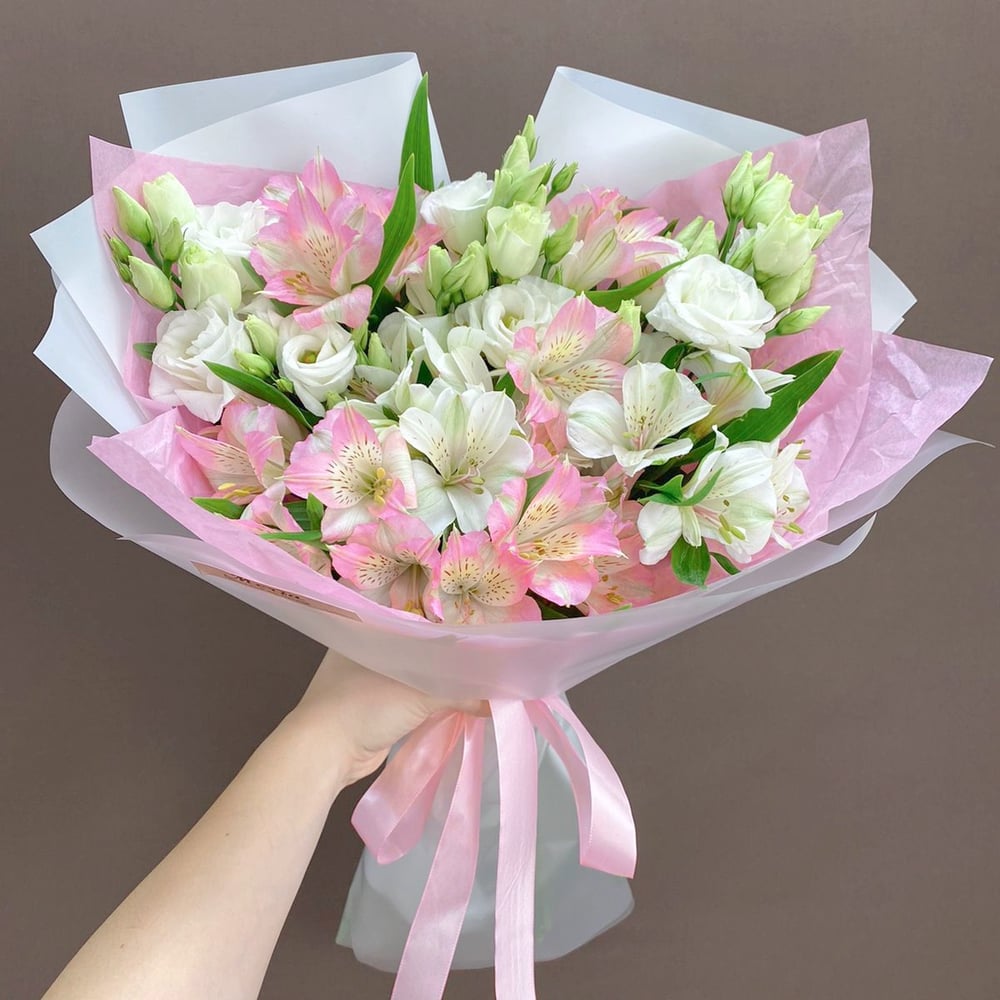 Этот нежный и изысканный букет состоит из прекрасных цветов – лизиантуса и альстромерии. Лизиантус, или эустома, символизирует возвышенность и изысканность, а альстромерия считается цветком дружбы и преданности. Букет упакован в стильную матовую пленку, а завершает его элегантная атласная лента. Этот букет будет отличным подарком для особенного человека.