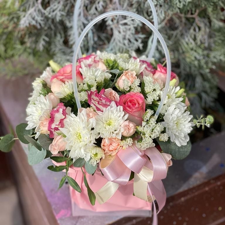 Коробка с цветами «Нежность в сумочке» из роз и хризантем