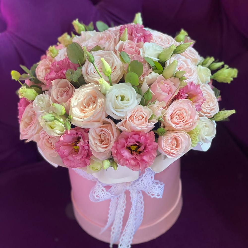 Шляпная коробка с цветами «Нежность звезд» из эустом и роз