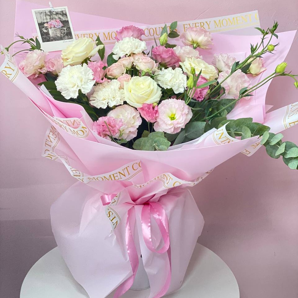 Этот нежный и элегантный букет включает в себя красивые розы, лизиантусы, диантусы, прекрасно дополненные зелеными листьями рускуса и эвкалипта. Букет упакован в прозрачную корейскую пленку, что добавляет ему особый шарм и делает его отличным подарком для любого случая.