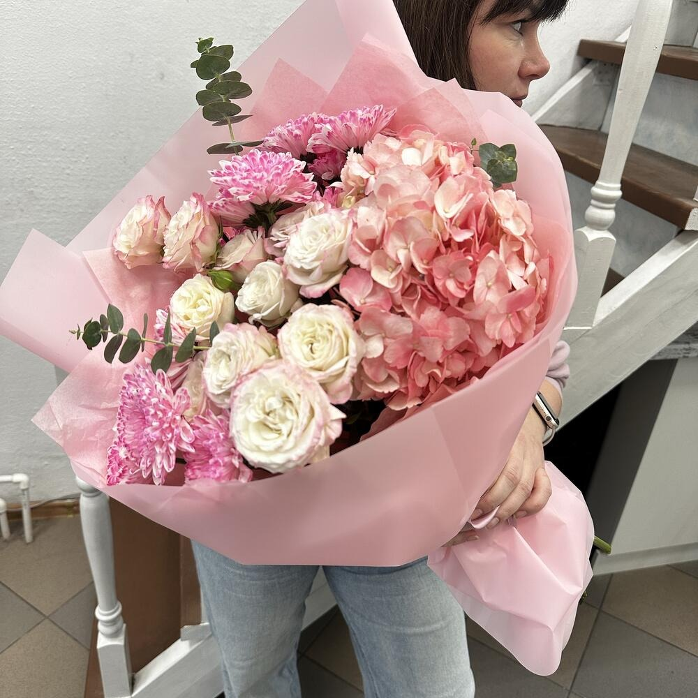 Нежный букет для любимой девушки, жены или подруги В составе этого букета гортензия, хризантемы и кустовые розы. В дополнении к нашим букетам идет Сладкий подарок от магазина