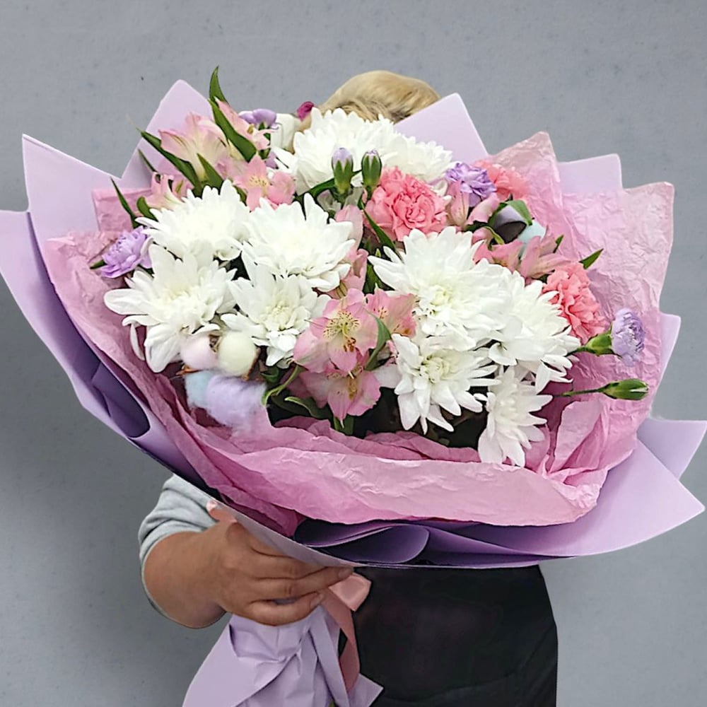Нежный букет из гвоздик и хризантем