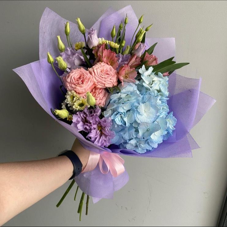 Нежный букет из гортензии с эустомами