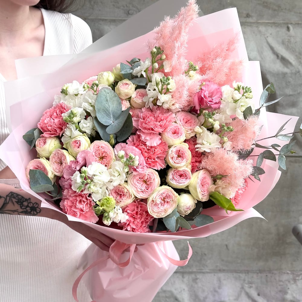 Изысканное сочетание нежных цветов: кустовая Роза , ароматная маттиола , очаровательная эустома. Тонкий аромат и нежная палитра цветов.
