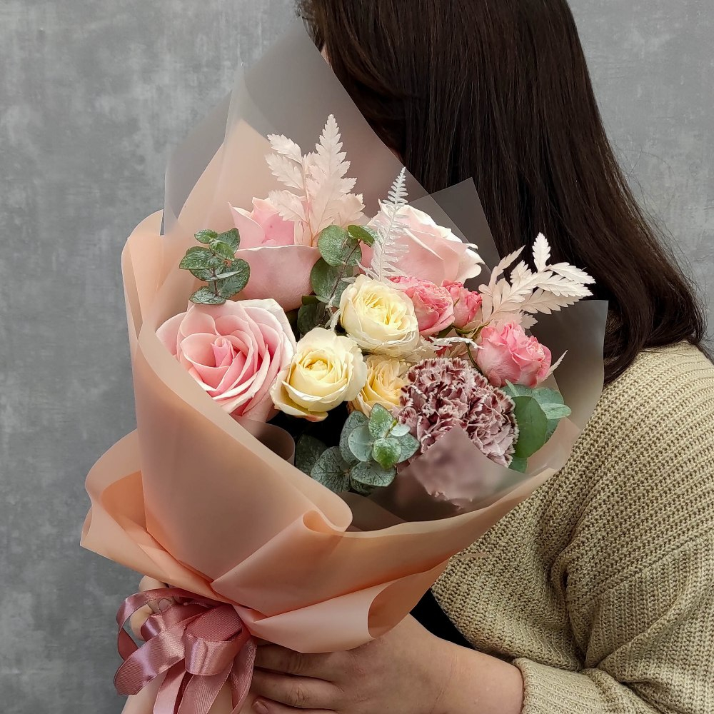 Состав: Роза Frutteto - 3 шт, Роза кустовая Salinero - 1 шт, Роза кустовая Madam Bombastic — 1 шт, Диантус Браун - 1 шт, Стабилизированный папоротник - 1 шт, Фисташка - 2 шт, Эвкалипт - 1 шт, Матовая пленка бежевая и белая матовая прозрачная уголком Размер: Диаметр: 25 см / Высота: 55 см Живые цветы - это одна из самых главных составляющих любого торжественного праздника. Красивые букеты и своеобразные цветочные композиции могут быть как просто презентом, так и потрясающим свежим украшением любого торжественного интерьера.