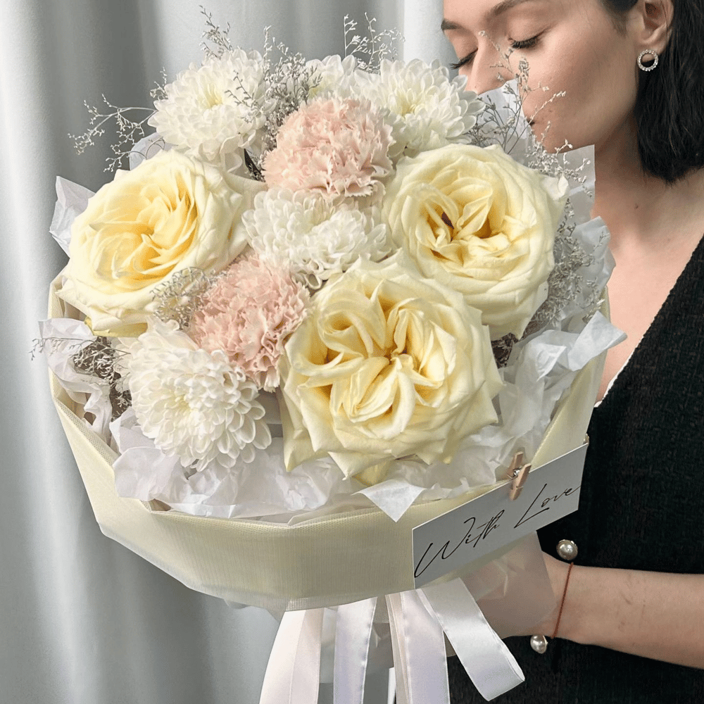 Нежный букет с ароматными розами, хризантемой и диантусами