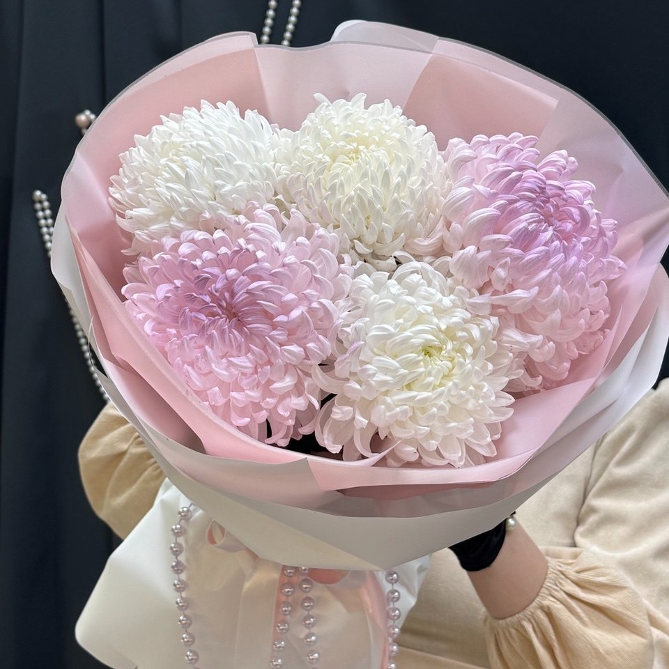 Представляем вам изысканный букет из 5 роскошных хризантем сорта Бигуди — воплощение элегантности и утонченной красоты. Нежные шарообразные бутоны с завитками лепестков создают неповторимую игру св...