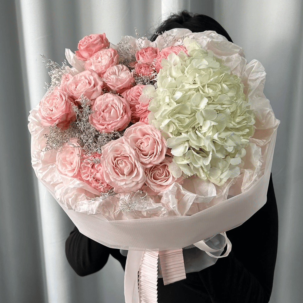 Нежный букет с пионовидными розами и гортензией