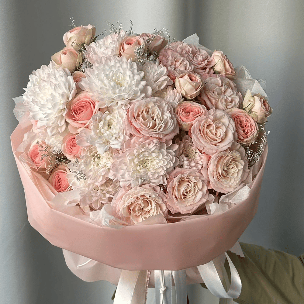 Нежный круглый букет с пионовидными кустовыми розами и хризантемой в круглой упаковке