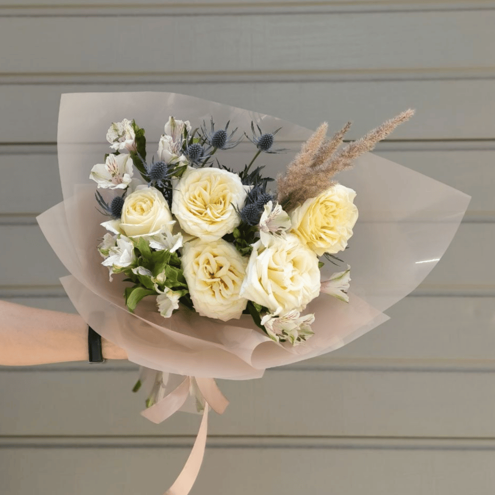 Букет-комплимент РОБКАЯ НЕЖНОСТЬ в нюдовой палитре, он очарует свою получательницу теплыми оттенками, и вызовет столько же эмоций, сколько и пирожное с заварным кремом и ягодной начинкой. ⠀ Состав: роза Канделайт - 5 шт., альстромерия - 3 шт., эрингиум - 2 шт., сухоцветы - 3 шт., упаковка, лента ⠀ Повод порадовать дорогих и близких людей букетом цветов может быть самым разным: день рождения, юбилей, памятная дата, встреча или свидание, выписка с новорождённым из роддома, желание поделиться пожеланиями или стремлениями через цветочный подарок, цветы в качестве благодарности или извинения. ⠀ Мы осуществляем доставку цветов, букетов и цветочных композиций по Красноярску, чтобы вы могли порадовать своих близких даже на расстоянии. Наши цветочные презенты идеально подходят для любого случая – дня рождения, юбилея или другого праздника. Не упустите шанс порадовать своих близких уникальными авторскими букетами и цветочными композициями с доставкой в Красноярске. Закажите у нас прямо сейчас и подарите незабываемые моменты радости.