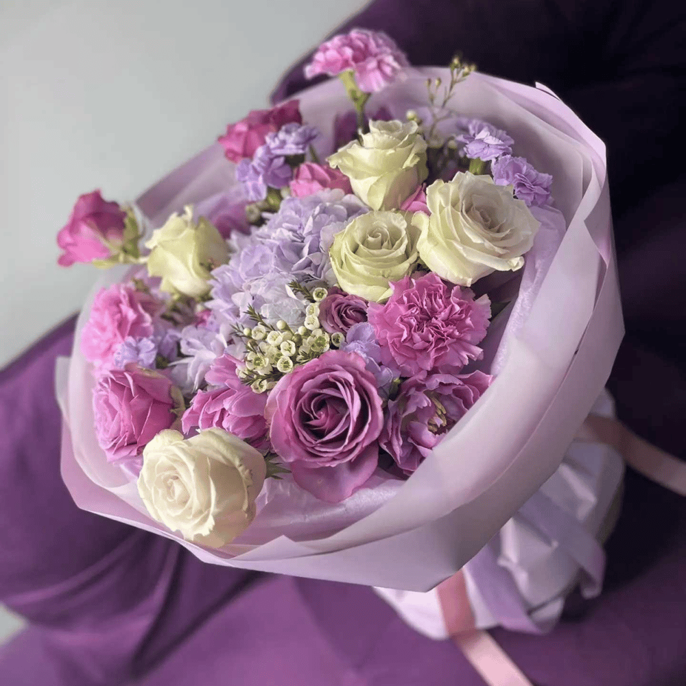 Нежный букет в лавандовом цвете из роз и гвоздик