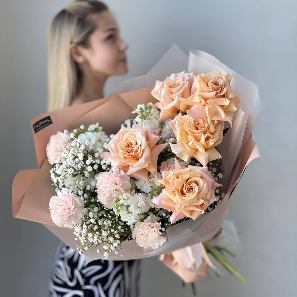 Этот утонченный букет сочетает в себе элегантные французские розы и изысканные диантусы, дополненные воздушной гипсофилой и ароматной маттиолой в нежных персиковых оттенках. Каждый цветок придает композиции легкость и романтику. Французские розы символизируют любовь и утонченность, диантусы добавляют шарм, а гипсофила и маттиола завершают этот восхитительный ансамбль. Букет идеально подойдет для выражения нежных чувств и создания атмосферы тепла и радости