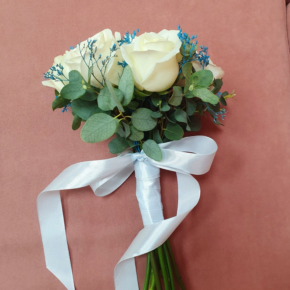 Классический букет невесты из роз с акцентной контрастной вставкой лимониума.