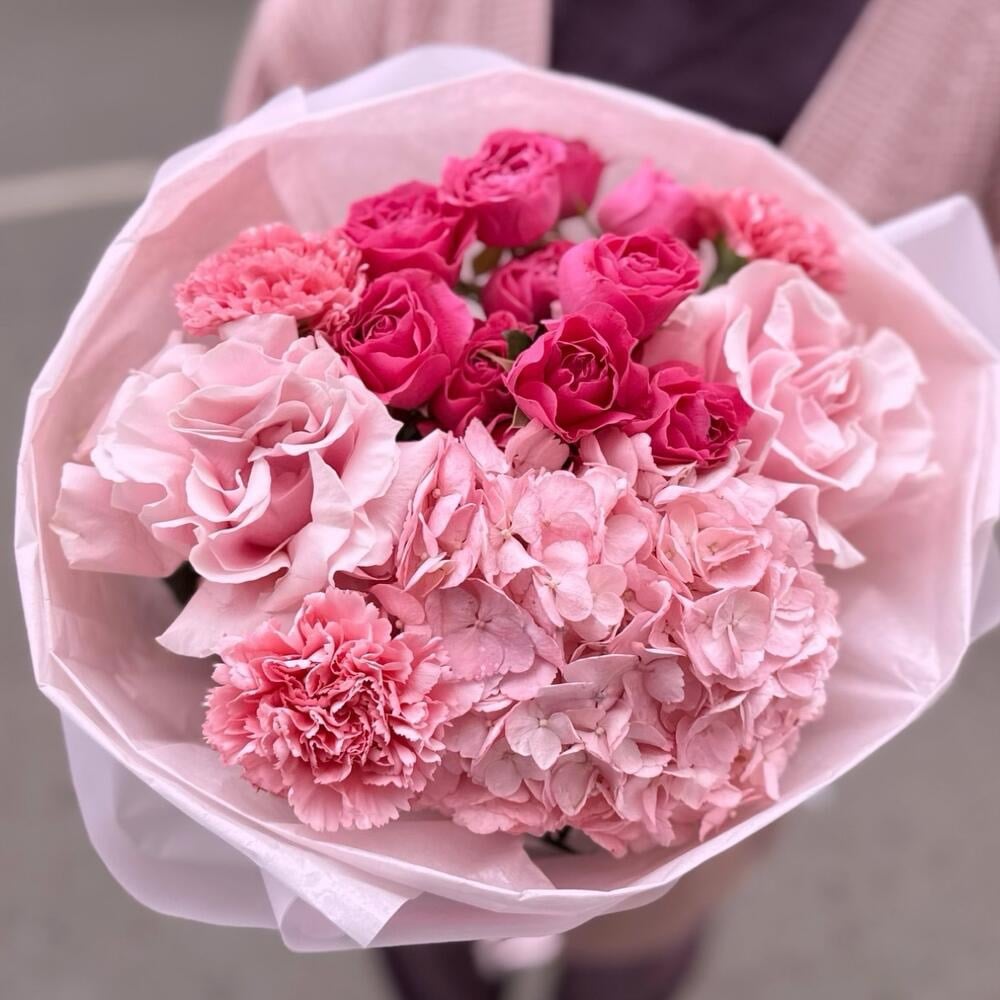 Гортензия, французкая роза, диантусы, пионовидная кустовая роза