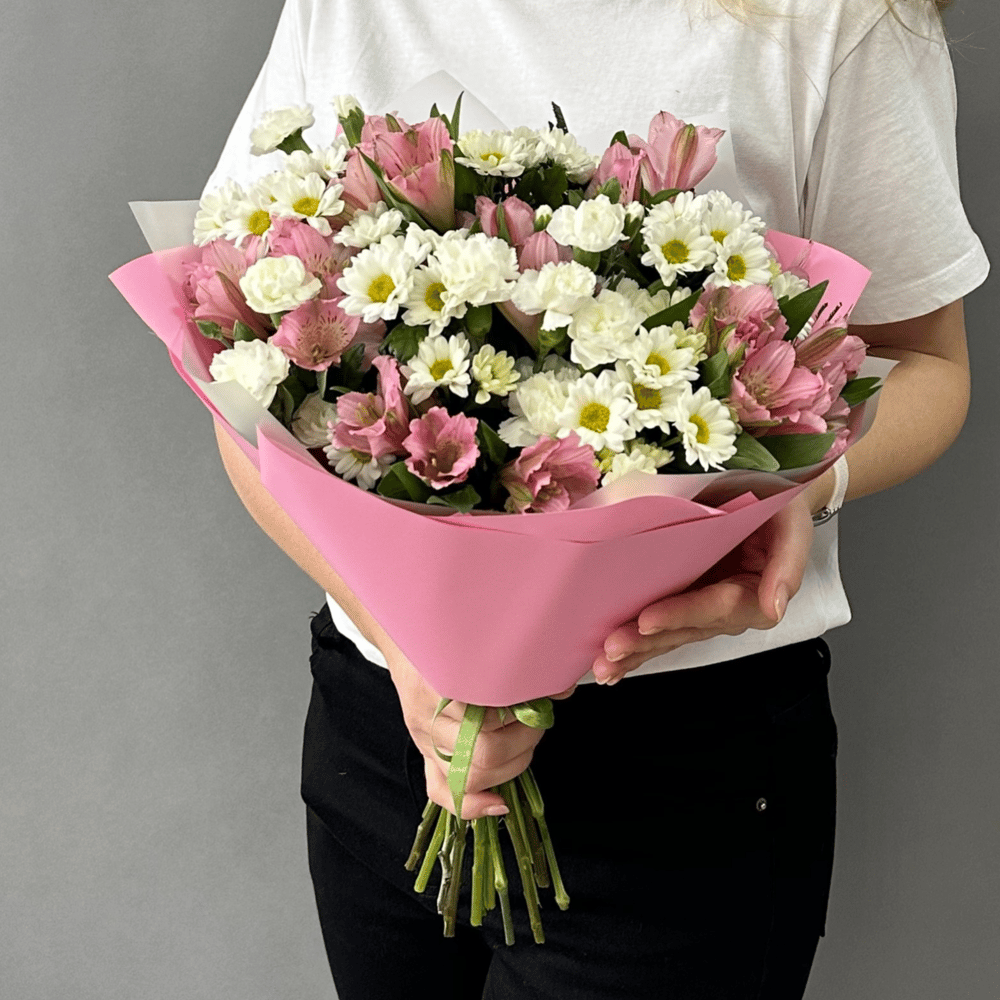 Нежный букет из стойких сортов - альстромерия, гвоздика кустовая, хризантема кустовая. Охапка цветов представляет собой милый букет в нежной розовой гамме Такой будет - это идеальный подарок, чтобы просто сделать комплимент, порадовать маму, учителя, коллег