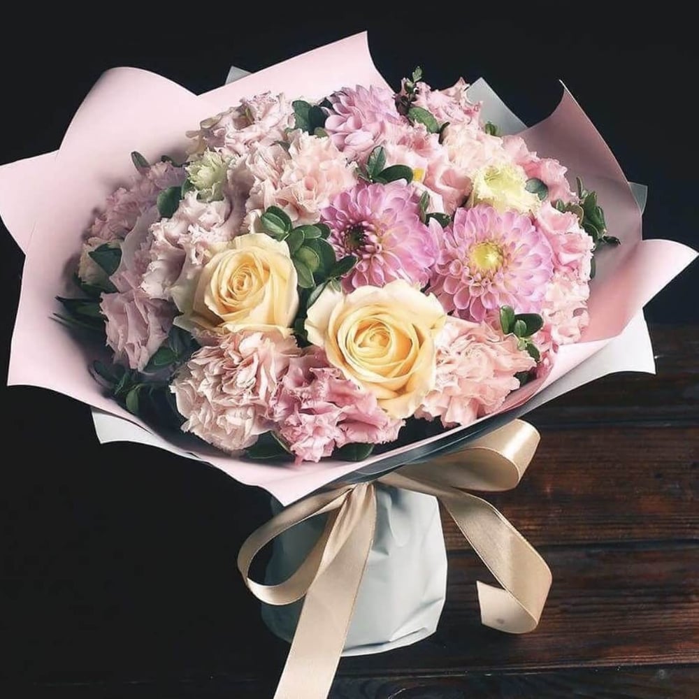 Элегантный букет в нежной цветовой гамме из роз, астры и эустомы будет идеальным подарком для любого праздника или особого случая. Этот букет станет украшением интерьера и подарит радость и восторг...