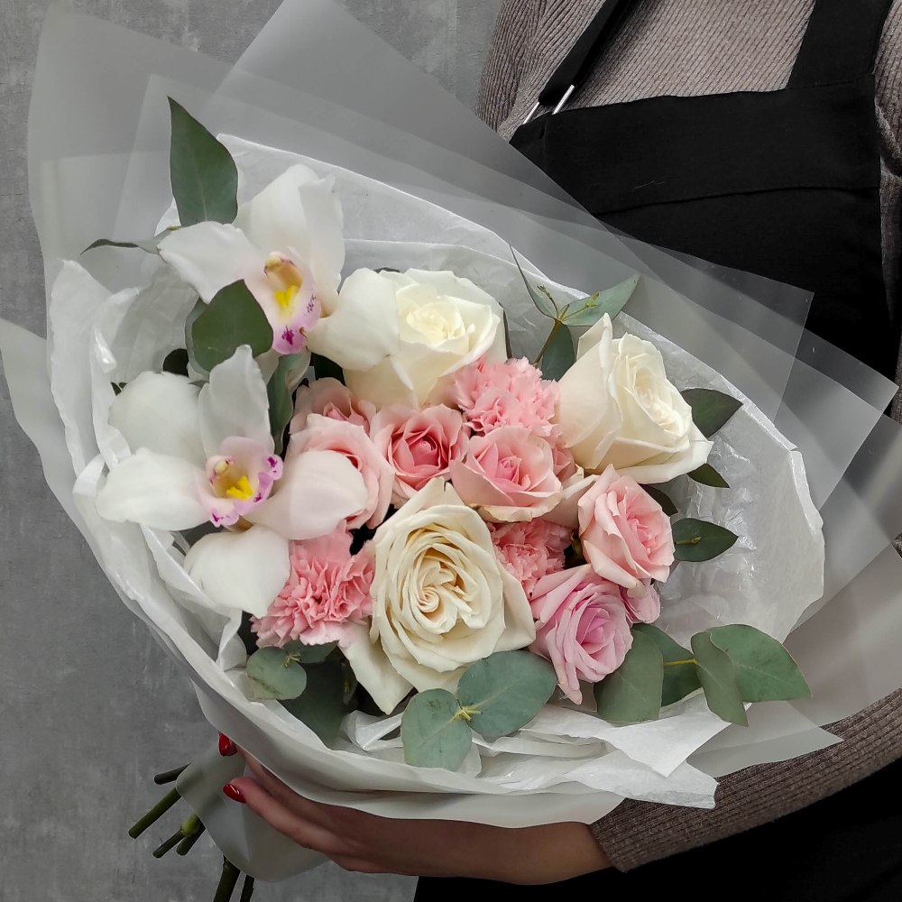 Состав: Роза Playa Blanca - 3 шт, Орхидея - 2 шт, Роза кустовая Star Blush - 2 шт, Диантус Pink - 3 шт, Фисташка - 2 шт, Эвкалипт цинерия — 1 шт, Тишью белая, Матовая пленка белая прозрачная ушками…