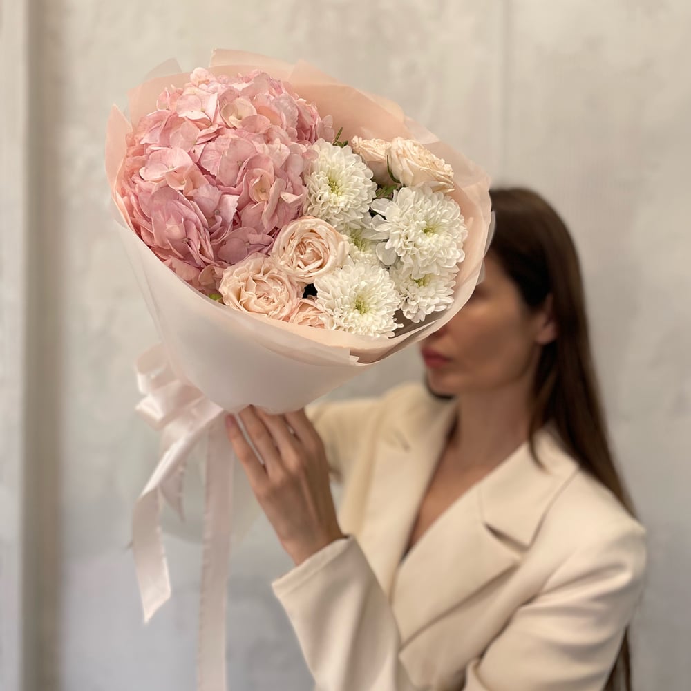 Нежный букет с кустовыми розами, гортензией и кустовой хризантемой В подарок к букету : -открытка с вашими пожеланиями -инструкция по уходу за букетом -средство для продления стойкости цветов