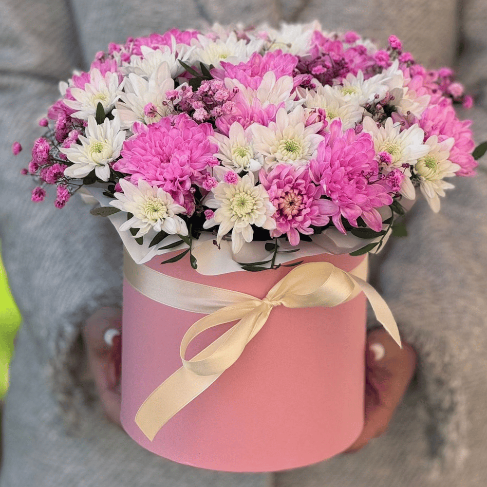 Шляпная коробка с цветами «Нежный трепет» из хризантем и гипсофил