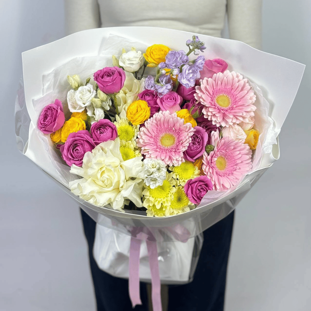 Этот изысканный букет, словно сошедший с полотна художника, очаровывает с первого взгляда. Нежные пастельные оттенки распускаются в гармоничном танце цветов, создавая неповторимую симфонию красок.