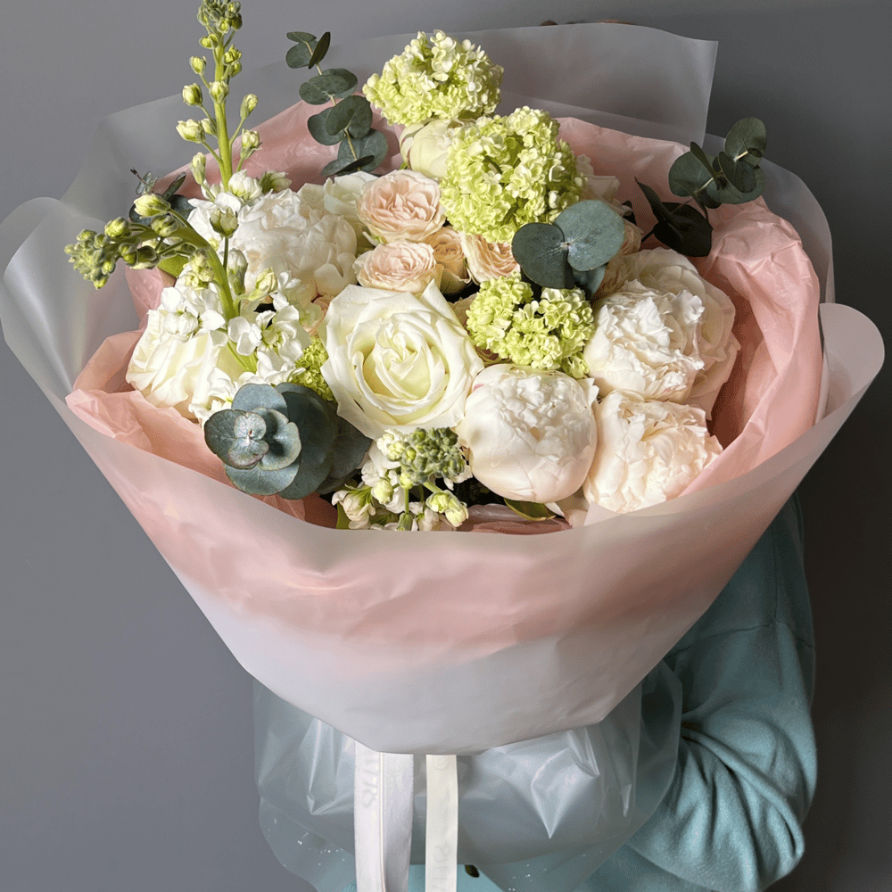 Нежный весенний букет с маттиолой и пион