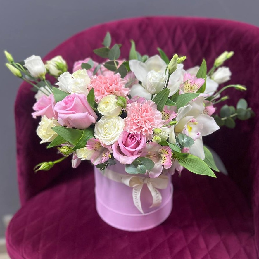 Цветочная композиция с орхидеями, розами, эустомами, альстромериями, диантусами и эвкалиптом. Композиция собрана в нежной бело-розовой цветовой гамме. Красивая и подарочная, пышная и раскидистая ко...