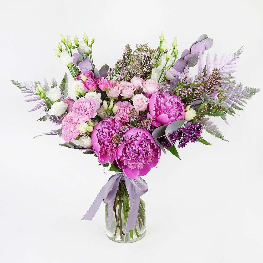 Летние вечера такие особенные и волшебные. Мы постарались воплотить его в красивой композиции из пионов, нежных кружевных гвоздик, ароматной сирени, лизиантусов и освежающего эвкалипта, чтобы вы пере…