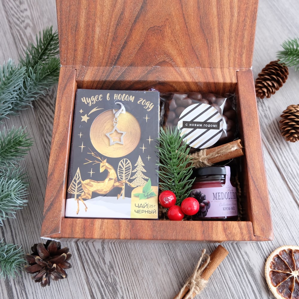 В наборе: 📌Коробка 18,5*16*5,8 см 📌Чай чёрный с брелоком-подвеской "Чудес в новом году" 📌Арахис в темном шоколаде 📌Крем-мед 40 гр (вкусы разные) 📌Декор