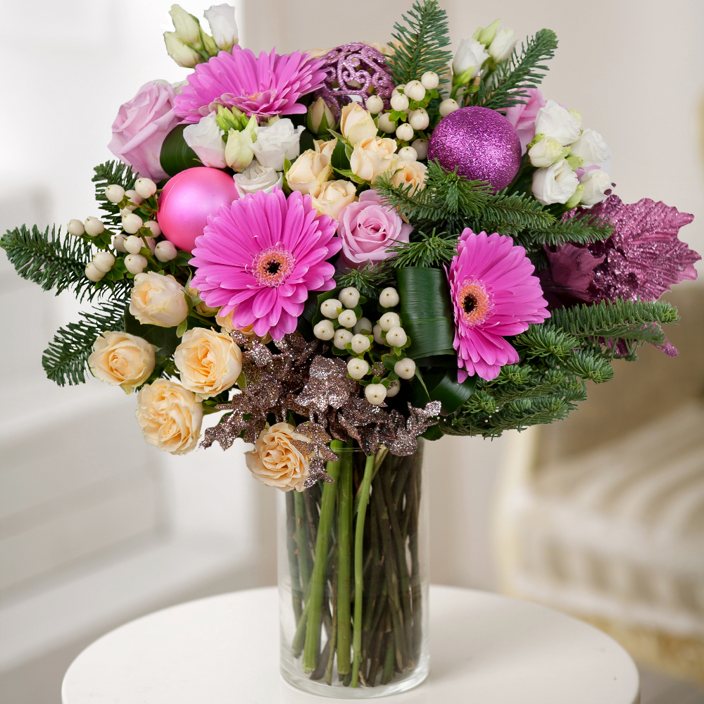 Need some holiday cheer? This elegant bouquet is ready to spread season’s best greetings everywhere! Bright purple roses and gerberas, white lisianthuses and tender cream spray roses are beautifully arranged with fragrant fir tree branches and festive ornaments to make that special someone smile.