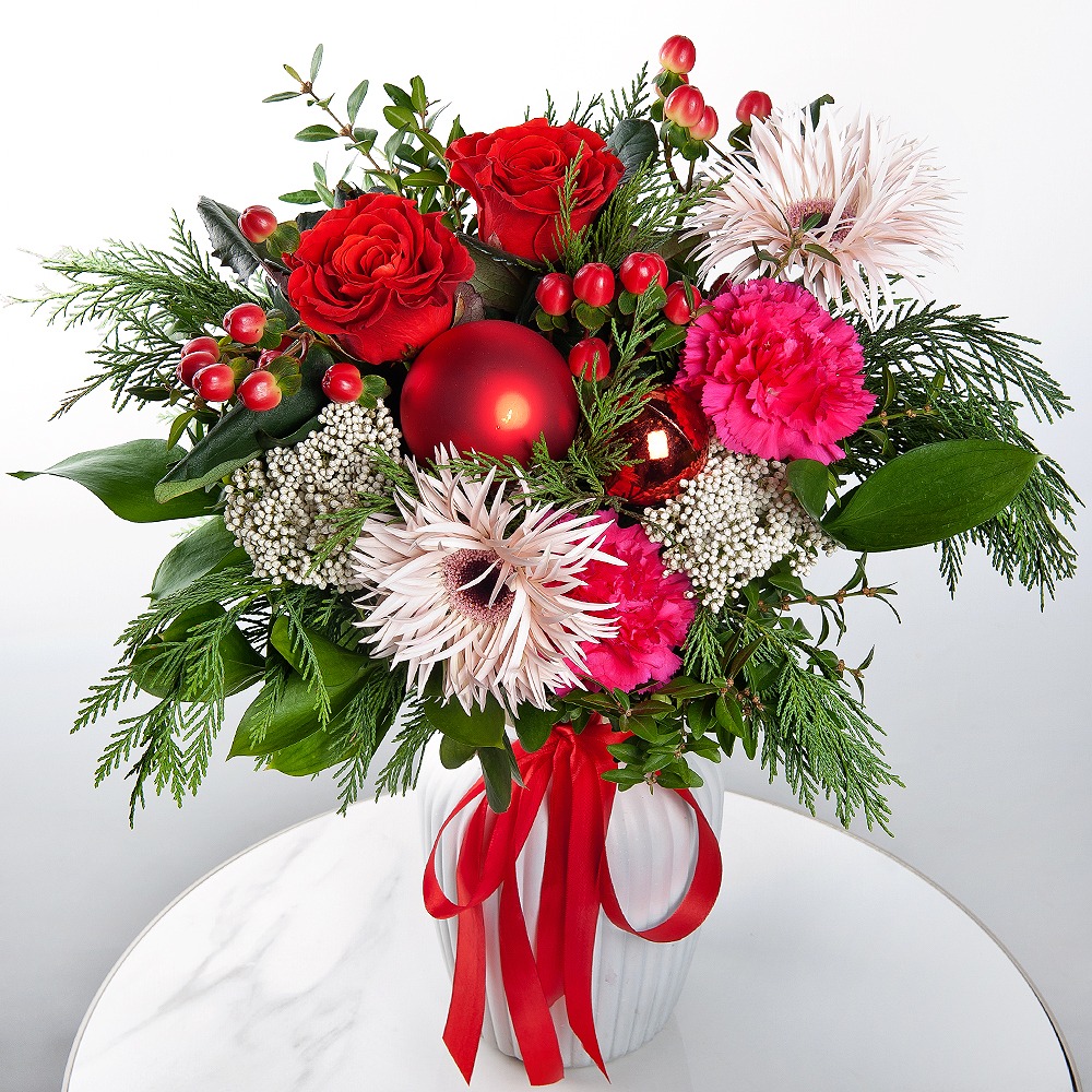 Уникальная композиция из роскошных роз, гербер, озотамнуса, гвоздик, рускуса, фисташки, гиперикума и туи, созданная специально для праздничного настроения. Эта яркая и стильная композиция станет прекрасным украшением вашего дома или офиса, добавит тепла и уюта в атмосферу и создаст ощущение настоящего новогоднего карнавала.