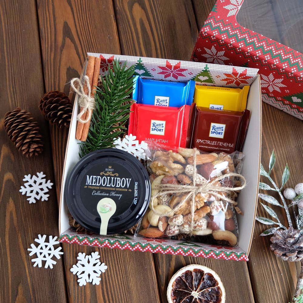 В наборе: 📌Коробка 14,5*14,5*6 см 📌Мёд-суфле 120 гр (вкусы разные) 📌Ореховый микс 📌Шоколад Ritter Sport mini 📌Декор