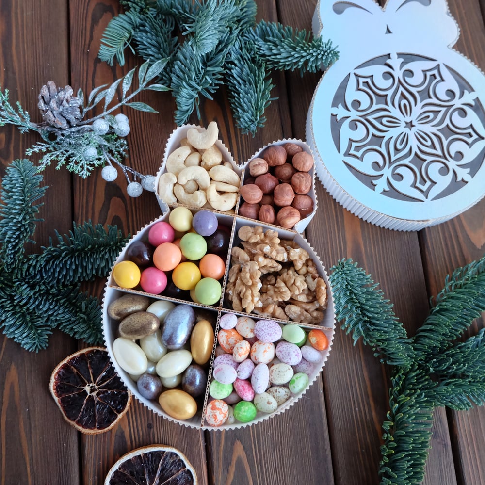 В наборе: 📌Коробка новогодний шар 20*15*5 см 📌Миндаль в шоколаде 📌Фундук в шоколаде 📌Арахис в шоколаде 📌Грецкий орех 📌Фундук 📌Кешью
