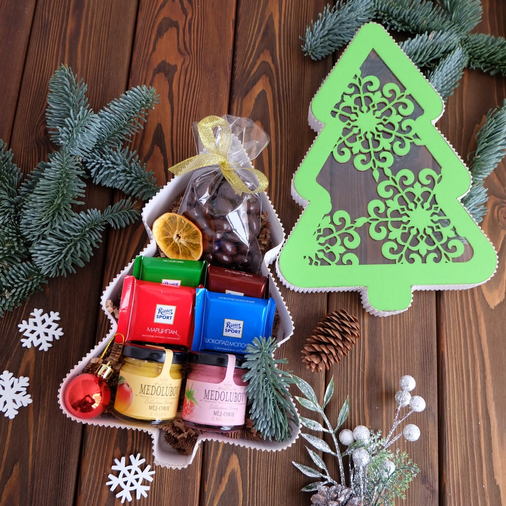 В наборе: 📌Коробка елочка 23*13*5 см 📌Арахис в шоколаде 📌Крем-мед 2 шт (по 40 гр, вкусы разные) 📌Шоколад Ritter Sport mini 📌Новогодние украшения, декор